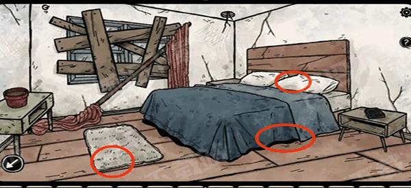 5、切换到巴斯蒂安,拿走床底以及垫子下方的半个面具和鱼钩,在枕头下方找到第二只收集要素。