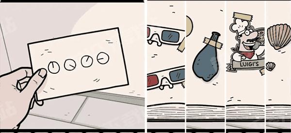 6、来到楼梯处,结合卡丽莎时间和笔记本里的提示找到对应顺序(影院、气球、餐厅、海边)的四个符号,用它们可以打开巴斯蒂安视角下的楼梯间拿到玩偶。