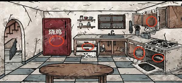 8、进入厨房搜索道具获得烧鸡、火柴和皮皮虾,灶台下方的两个柜子可以找到第三只收藏要素和饼干提示(饼干图案和顺序)。