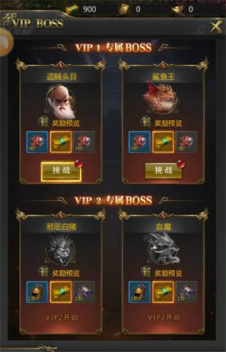 接下来系统会让玩家挑战vip boss,在这里分别有盗贼头目、鲨鱼王、邪恶白猪、血魔。