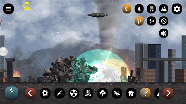 1、打开游戏,可以看到底栏有多种灾害手段,像是龙卷风、核弹、飞碟、地震等等,可以任意选择一种灾害来破坏城市,非常的过瘾